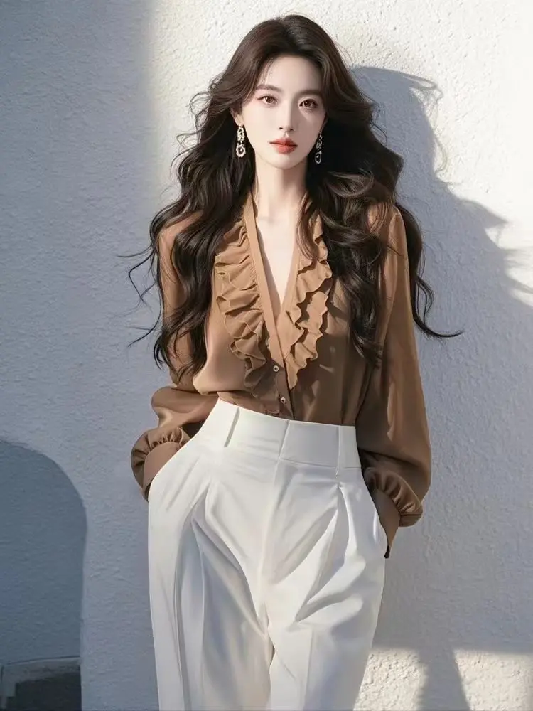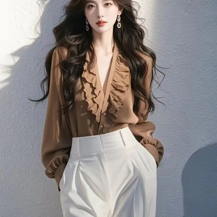 Spring Temperament Ruffles V-neck Shirts Ladies Fashion Solid Color Long Sleeve Blouse Autumn Simplicity Elegant Buttons Top Tee