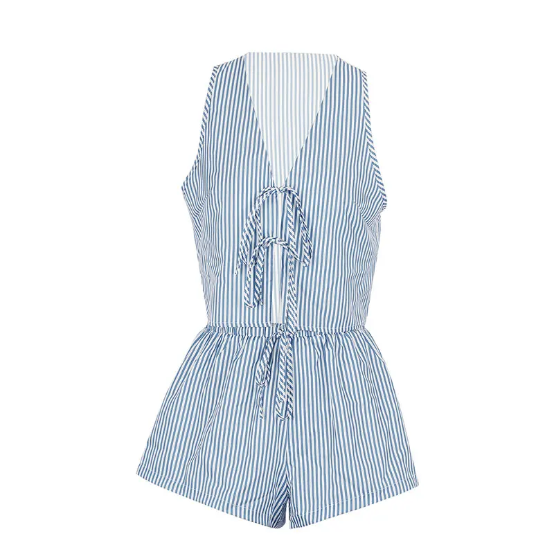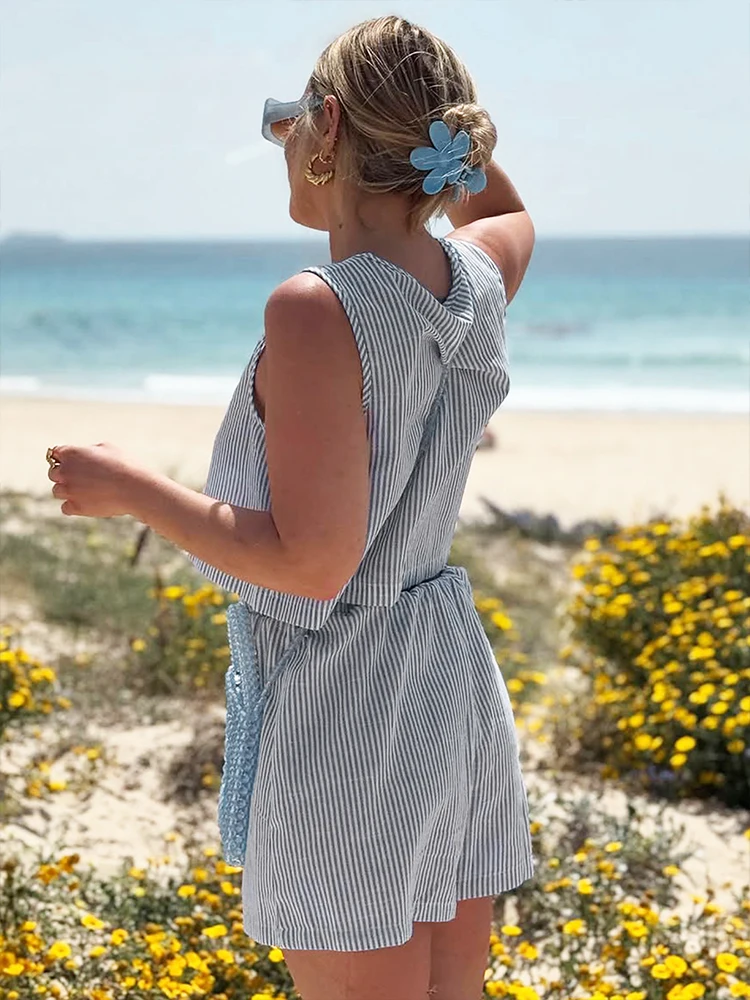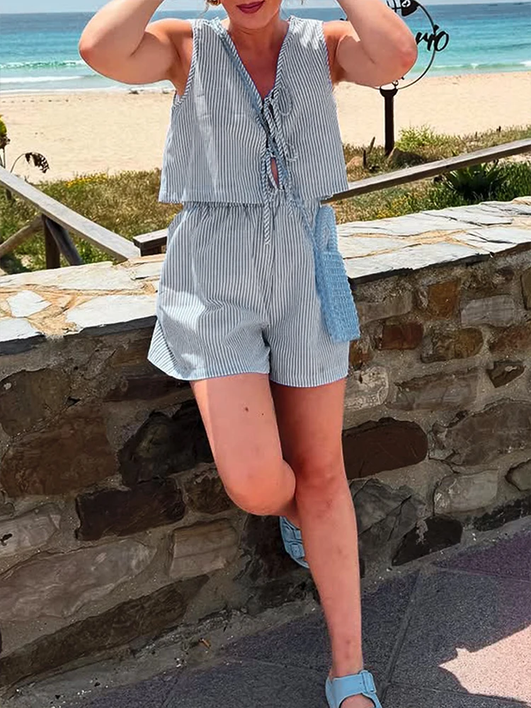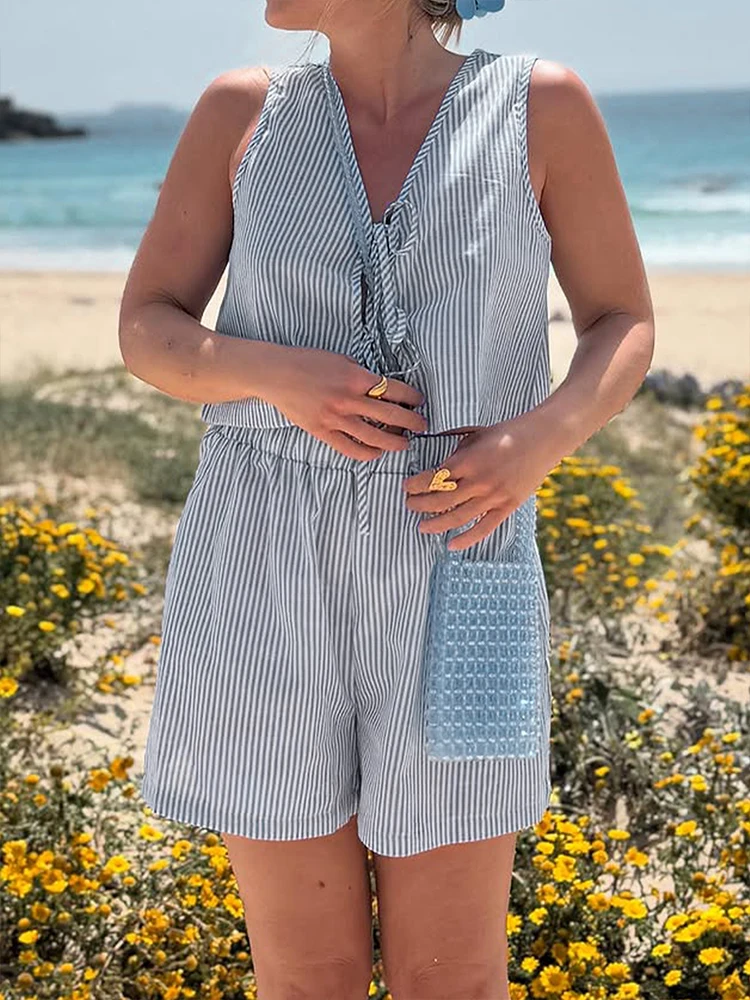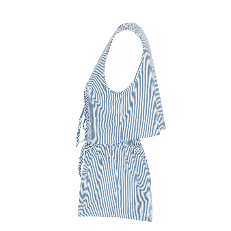 Summer Women Tank Pants Beach Style Suit Streetwear Fashion Striped Lace-up Tank Casual Slim Shorts 2 Piece Lady Sexy Partywear